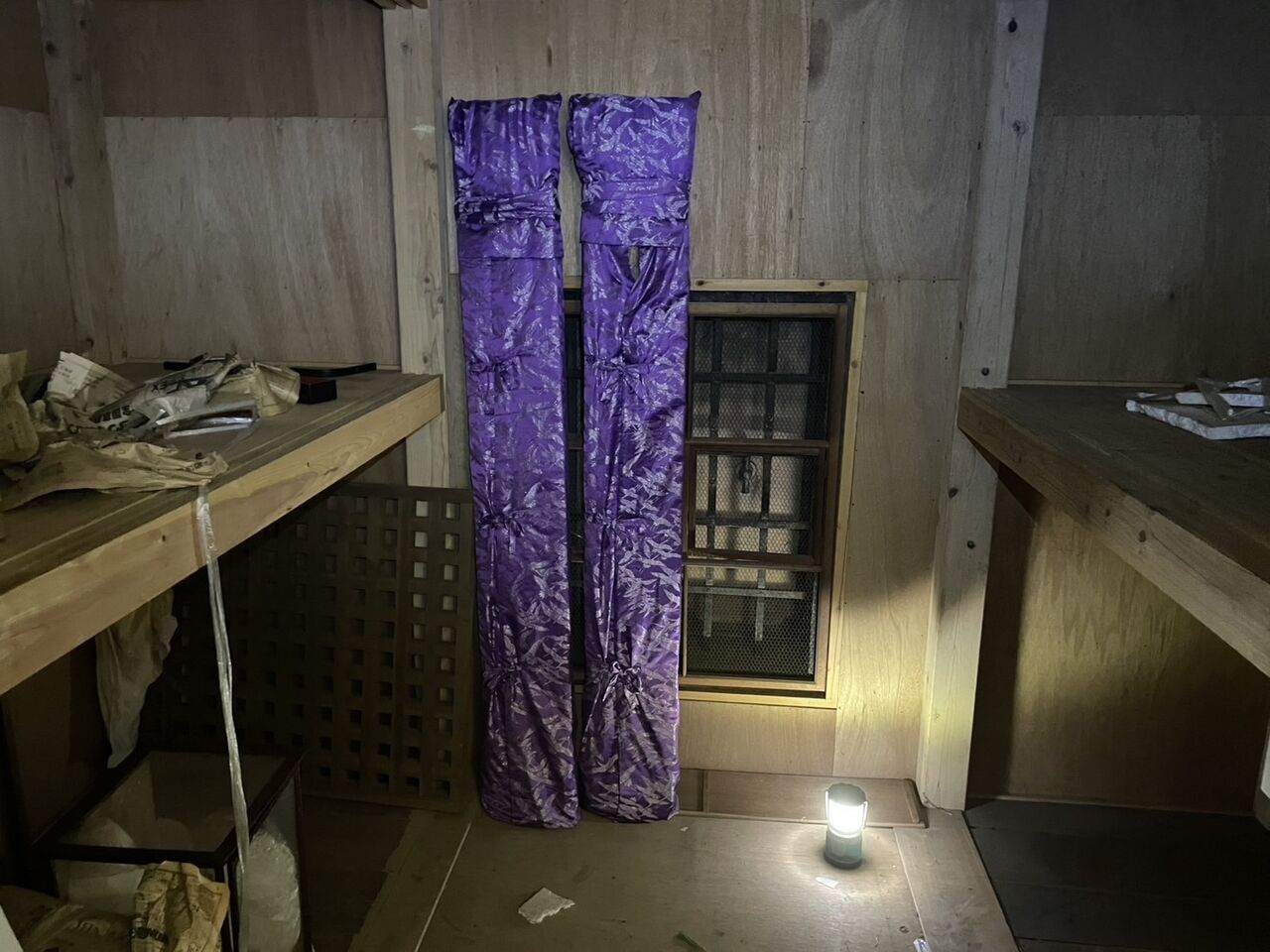日が落ちて夕暮れに差し掛かるころ、蔵の荷物運び出しが終わり、実際に蔵の中を見学させてもらえました。荷物を運び出した後だと、想像していたよりも広く感じ、蔵にはこんなにも荷物を収容することができるのかと実感しました。
