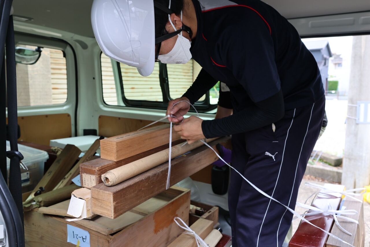 運び出した荷物はハイエースに整理しながら積み込み、吉野作蔵記念館に運ばれました。蔵の中から貴重な資料が多く見つかったため、1回では運びきれず、何往復もしながら作業を行いました。
